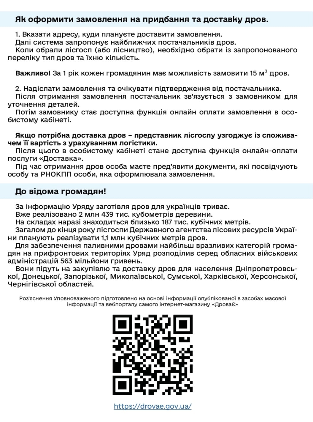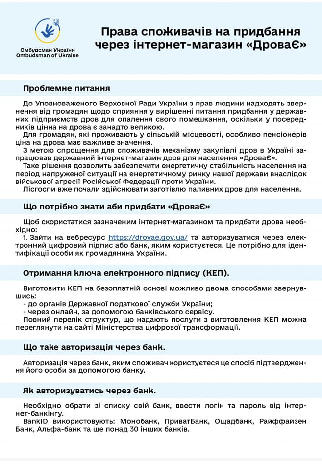 До Уповноваженого Верховної Ради України з прав людини надходять звернення від громадян щодо сприяння у вирішенні питання придбання у державних підприємств дров для опалення свого помешкання, оскільки у посередників ціна на дрова є занадто великою.3 метою спрощення для споживачів механізму закупівлі дров в Україні запрацював державний інтернет-магазин дров для населення «ДроваЄ».