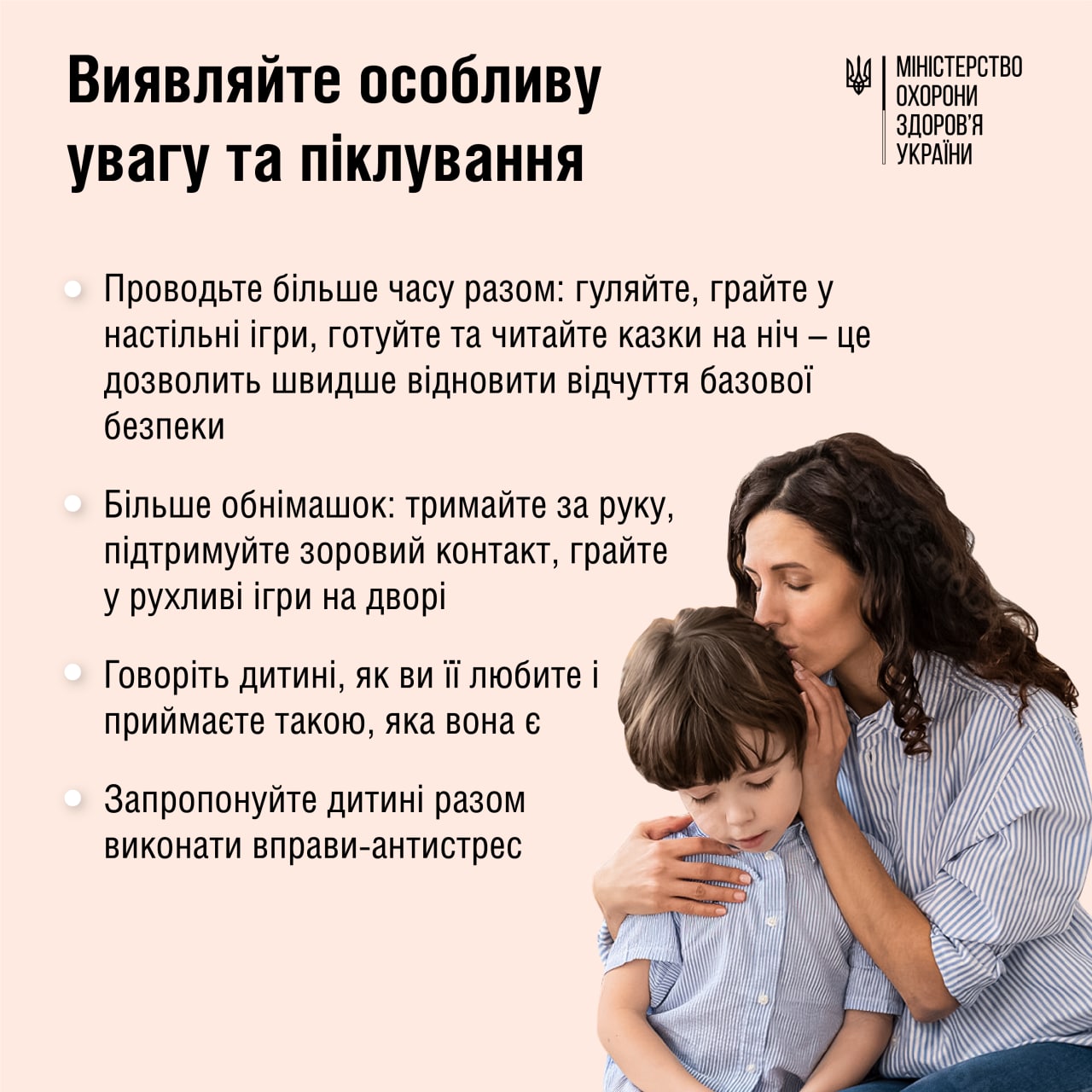 Дитина, яка переживає негативні наслідки сильного стресу, може почуватися відчуженою, страждати від самотності, безсилля і безпорадності. Для неї надзвичайно важливо отримувати особливу увагу та піклування з боку батьків. Варто частіше якісно проводити час разом: гуляти, грати у настільні ігри тощо. Важливо також частіше обіймати дитину, погладжувати її, робити жартівливі масажі, тримати за руки, підтримувати зоровий контакт, гратися у рухливі ігри на свіжому повітрі.